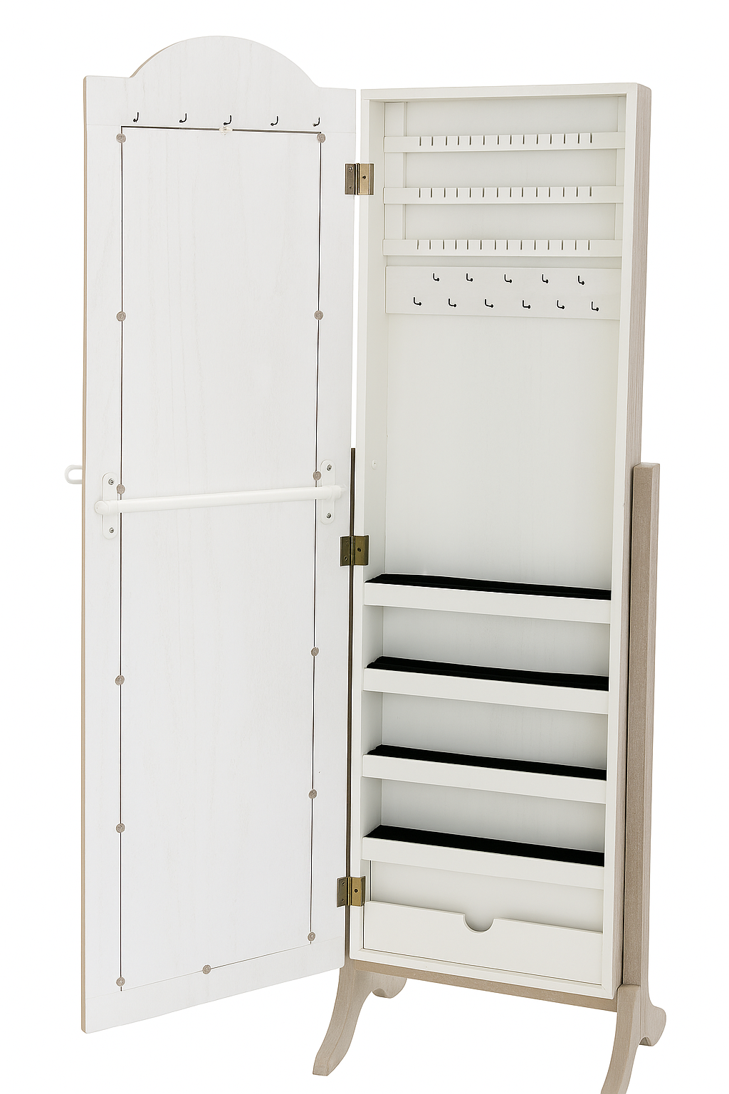 Spoj praktičnosti i luksuza – ovo moderno stojeće zrcalo nije samo dekoracija, već i pametno rješenje za pohranu nakita, kozmetike i modnih dodataka. Idealno za spavaće sobe, garderobe ili hodnike, pruža preglednost, organizaciju i eleganciju u jednom.