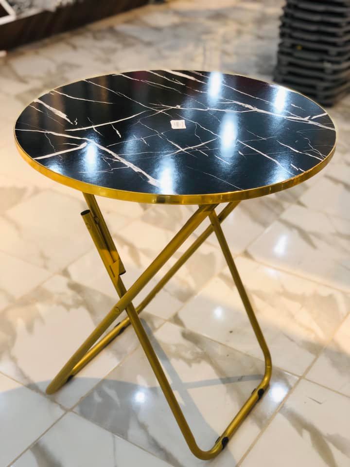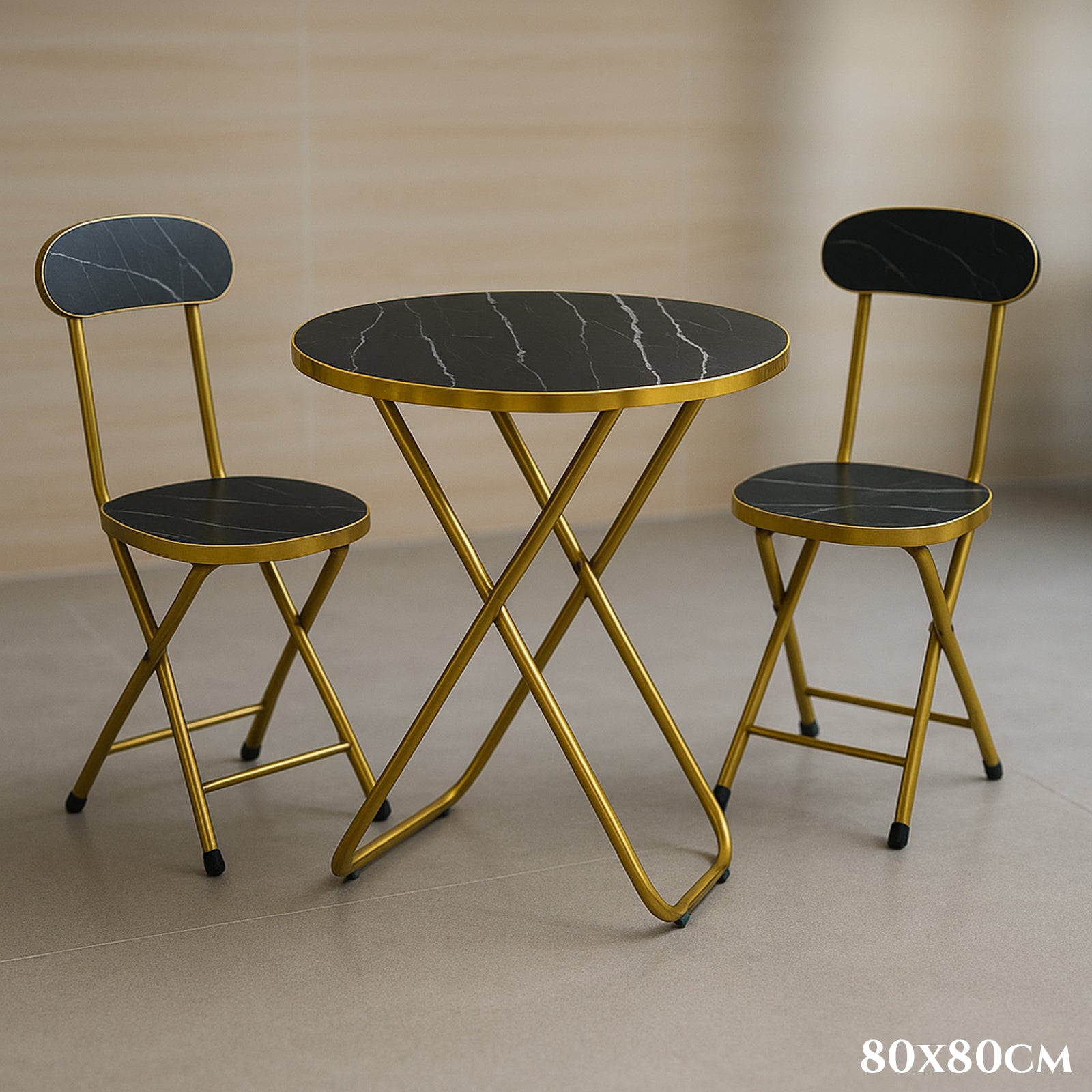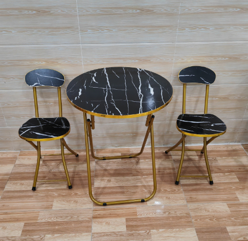 Kompaktni set stola i dviju sklopivih stolica s efektom crnog mramora unosi dašak luksuza u svaki prostor – od malog balkona do elegantne kuhinje. Zlaćani metalni okvir naglašava moderan karakter i savršeno se uklapa uz svjetle zidove, drvene tonove i minimalistički stil uređenja.